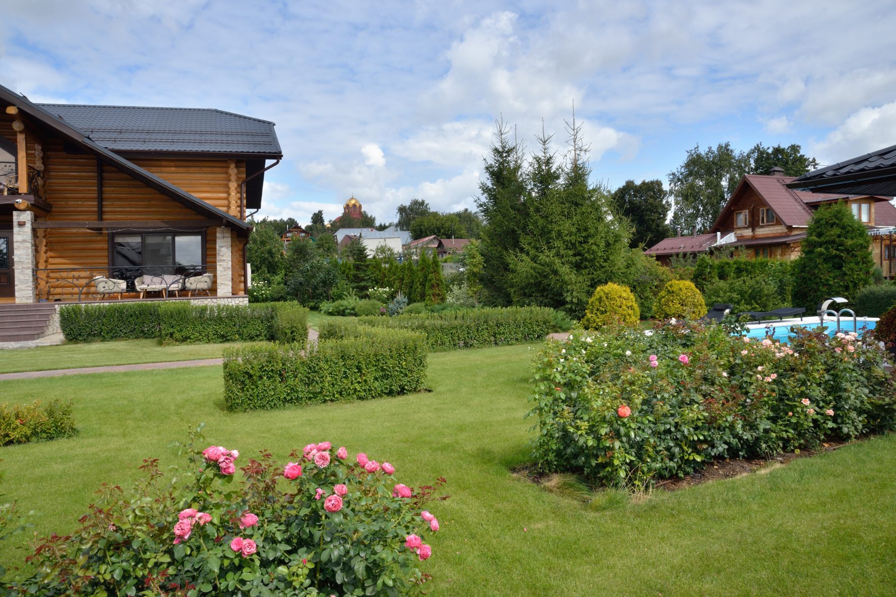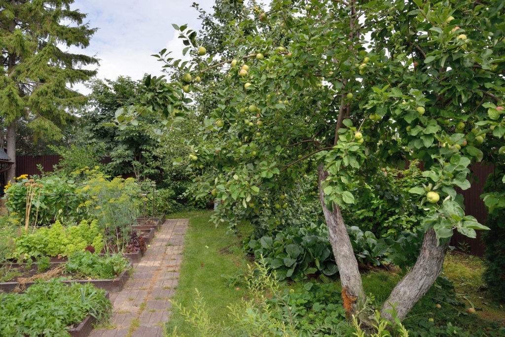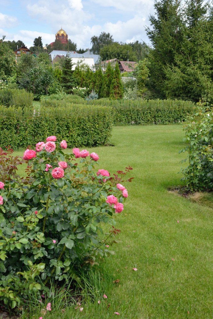 Fin dall’ ingresso della proprietà si notano il rigore del progetto, rappresentato da un prato davanti la casa, con i percorsi segnati da aiuole di Cotoneaster lucidus e di rose floribunde Leonardo daVinci che conducono alle varie zone. Margarita ci invita a vedere la zona dedicata all’ orto, sul retro dell’ abitazione, accanto a un edificio adibito a sauna; le aiuole sono delimitate da assi in legno che accolgono cetrioli, pomodori, cavoli e insalate e sul lato destro alcuni alberi di mele (coltivare mele fa parte della grande tradizione russa). Le essenze fiorite messe a dimora in questa zona sono rappresentate da alcune ortensie, da numerose Hoste con grandi e perfette foglie,- qui non ci sono lumache, ci racconta Margarita , quindi crescono rigogliose. Le peonie non sono ancora fiorite mentre le rose e la Datura portano alcuni fiori. Cattura l’ attenzione per la sua “leggerezza” una insolita clematide, la Clematis mandshurica.