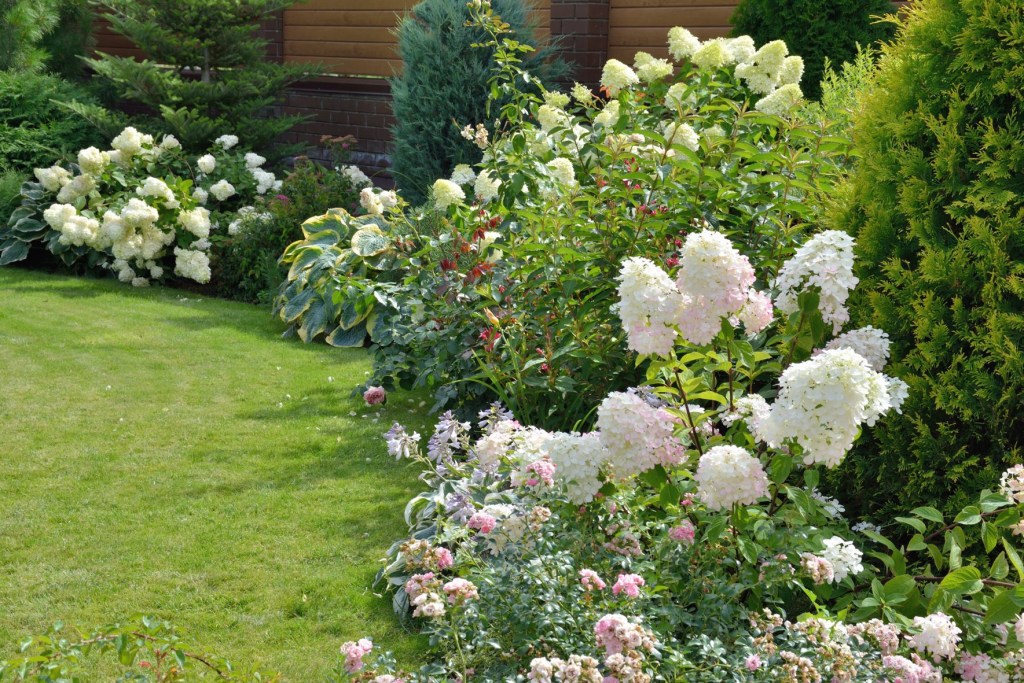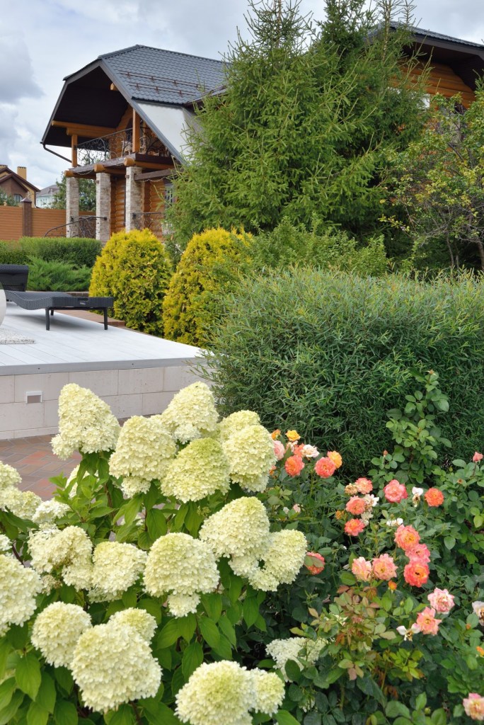 Superata la zona piscina, attraverso un verde e curato prato si raggiunge l’ edificio adibito ad autorimessa. Qui la paesaggista ha voluto creare un bordo misto, prendendo spunto da quelli inglesi, ma le essenze sono state scelte dalla proprietaria: conifere, Hoste,una Weigelia florida qualche rosa, alcune Hidrangea Paniculata Lime light e Sundaw Fraise