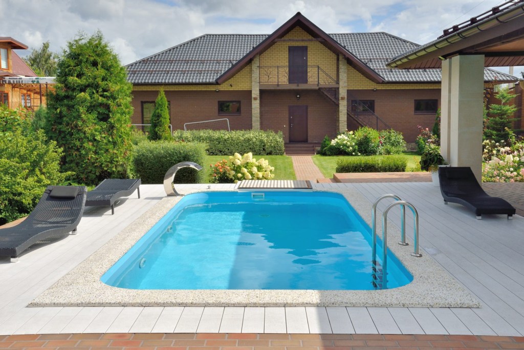 Una parte del giardino, leggermente sopraelevata, è riservata alla piscina e lo specchio d’ acqua riflette i colori del cielo; l’ adiacente soggiorno all’ aperto con la parete attrezzata per la cottura di cibi, é realizzato su progetto di Margarita, con materiali naturali. Le basi dei pilastri sono ingentiliti da vasi di coleus e petunie.