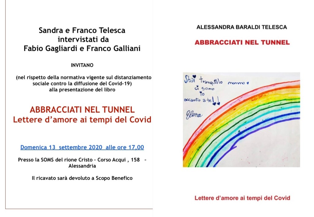 Domenica 13 settembre alle ore 17.00 presso la SOMS del rione Cristo di Alessandria – Corso Acqui 158, (nel rispetto della normativa vigente sul distanziamento sociale contro la diffusione del Covid-19), Sandra e Franco TELESCA intervistati da Fabio Gagliardi e Franco Galliani presentano il libro “ABBRACCIATI NEL TUNNEL Lettere d’amore ai tempi del Covid “.