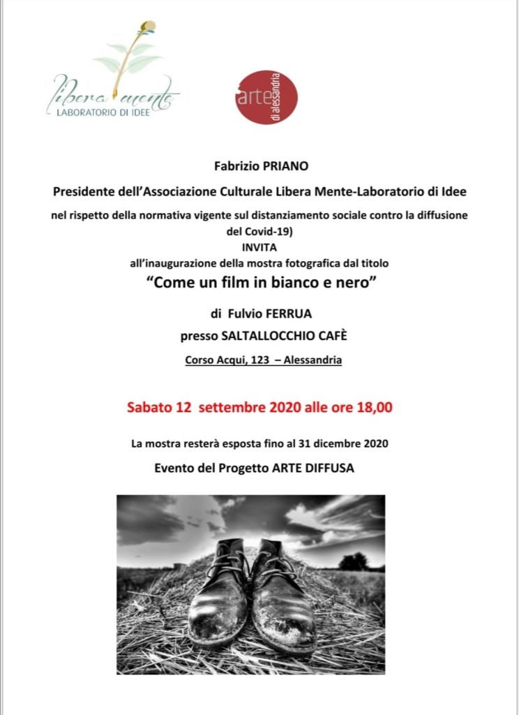 “Con la mostra fotografica dedicata a Fulvio FERRUA proseguono gli appuntamenti del Progetto ARTE DIFFUSA, eventi dedicati all’Arte presso alcuni locali della nostra Città. Fulvio FERRUA, artista dalla spiccata sensibilità presenta un emozionante percorso fotografico caratterizzato da un elegante bianco e nero”.