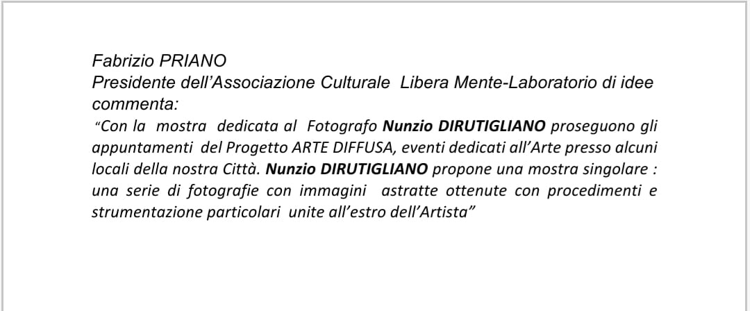 NUNZIO DIRUTIGLIANO intervistato da Lia Tommi di Alessandria Today Pubblicato daFrancesca Parrilla9 agosto 2021Pubblicato in: Senza categoria https://alessandria.today/2021/08/09/lia-tommi-intervista-il-fotografo-nunzio-dirutigliano-video2/ Condividi: Fai clic per condividere su X (Si apre in una nuova finestra) X Fai clic per condividere su Facebook (Si apre in una nuova finestra) Facebook Mi piace Caricamento...