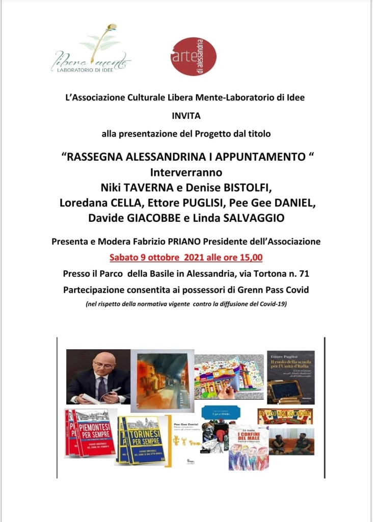 Presidente dell’Associazione Culturale Libera Mente-Laboratorio di idee presenta il nuovo progetto : “La Rassegna Alessandrina è nata dall’idea di creare una manifestazione in Alessandria, ispirata alla Versiliana, che potesse durare tutta l’estate con svariati eventi in luoghi diversi. Purtroppo a causa del Lockdown e delle restrizioni conseguenti non è stato possibile sviluppare il progetto calendarizzando gli eventi. Per questo motivo ho chiamato la Rassegna Alessandrina di quest’anno la “numero zero” organizzando una manifestazione che comprendesse in un solo pomeriggio e in un unico giardino quello che poi, a partire dal prossimo anno, sarà il numero uno e vedrà diversi appuntamenti, in diversi giardini sia pubblici che privati. Il “numero zero” prevede in un pomeriggio autunnale, nell’elegante giardino della casa Basile eventi vari così da creare un format della durata complessiva di circa tre ore. La manifestazione vedrà susseguirsi una mostra di due Artiste molto interessanti con stili molto diversi tra loro: una è pittrice che dipinge in acquarello e l’altra è illustratrice grafica. Entrambe raffigurano piazze, monumenti, spazi della nostra Città in modo raffinato e colorato. Dopo l’inaugurazione di queste due mostre si terranno presentazioni di libri ed eventuali relativi dibattiti riguardanti le opere di Loredana CELLA, Ettore PUGLISI e Pee Gee DANIEL.