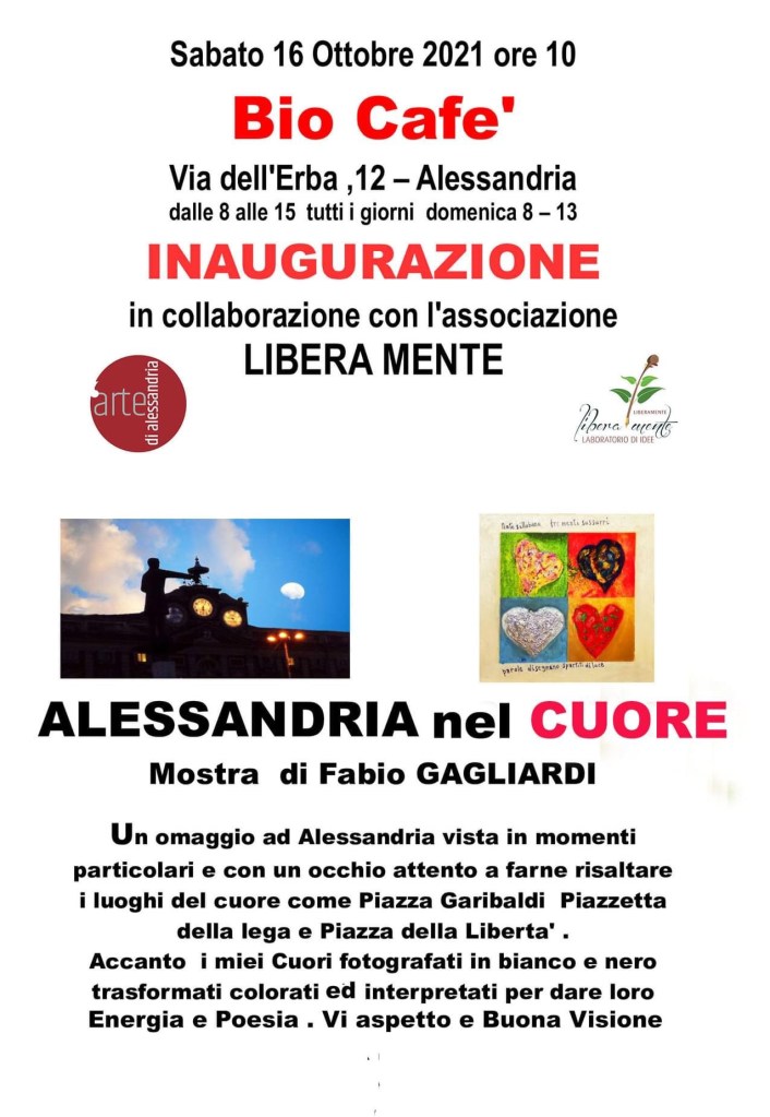 “Con la mostra dedicata al Fotografo Fabio GAGLIARDI proseguono gli appuntamenti del Progetto ARTE DIFFUSA, eventi dedicati all’Arte presso alcuni locali della nostra Città. Fabio Gagliardi è un amico della nostra Associazione e con lui abbiamo già avuto diverse collaborazioni, dalla fotografia alla poesia. Con questa mostra dal titolo “Alessandria nel Cuore”, abbiamo uno spaccato dell’opera di Fabio Gagliardi , molto significativo e interessante.”